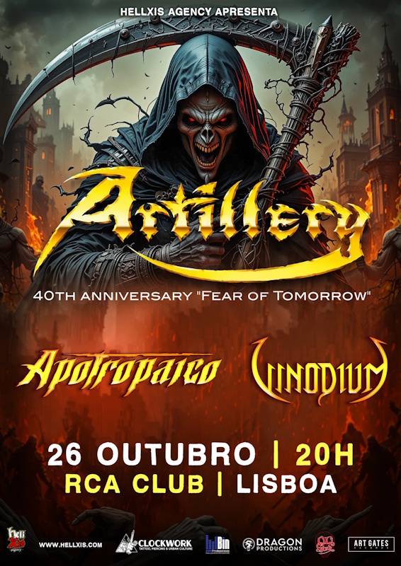Os mestres do thrash metal dinamarquês Artillery vão regressar ao nosso país pelas mãos da Hell Xis Agency no próximo dia 26 de Outubro, no RCA Club. Faz quarenta anos que foi lançado o clássico álbum de estreia, “Fear Of Tomorrow”, pelo que esta será uma oportunidade imperdível para celebrar um dos grandes álbuns da música pesada europeia. A acompanhar estarão os Apotropaico e Vinodium. Os bilhetes já estão à venda na Clockwork Store e no seguinte link – https://tinyurl.com/dpa2pj6s