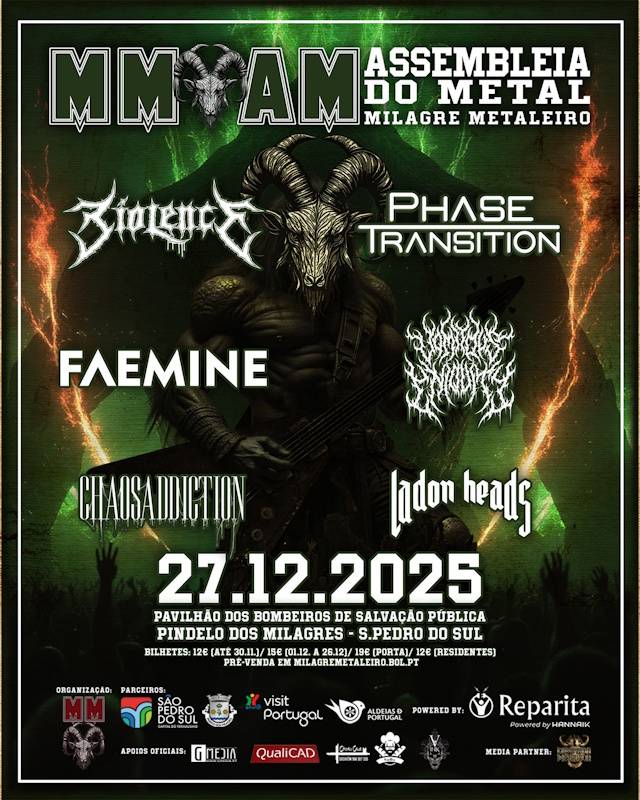 O Assembleia do Metal está de volta em 2025 para mais uma festa épica que é o último grande evento metálico do ano. O cartaz é composto por Biolence, Phase Transition, Faemine, Vomitous Iniquity, ChaosAddiction e Ladon Heads. Bilhetes disponíveis em milagremetaleiro.bol.pt: