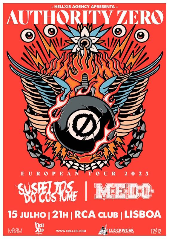 Foram confirmados para tornar a estreia dos Authority Zero no nosso pais ainda mais especial dois grandes nomes do punk e hardcore nacional: do punk e do Alentejo, os Suspeitos do Costume; do hardcore e do Algarve, os M.E.D.O.! Está marcada a festa para o dia 15 de Julho, pelas 21 h, no RCA Club. Os Authority Zero são norte-americanos e são conhecidos pela sua mistura energética de punk rock e ska/reggae. Esta será uma oportunidade única para presenciar a estreia da banda no nosso país, num concerto se antevê como memorável, numa produção da Hell Xis Agency. Os bilhetes estão disponíveis aqui.