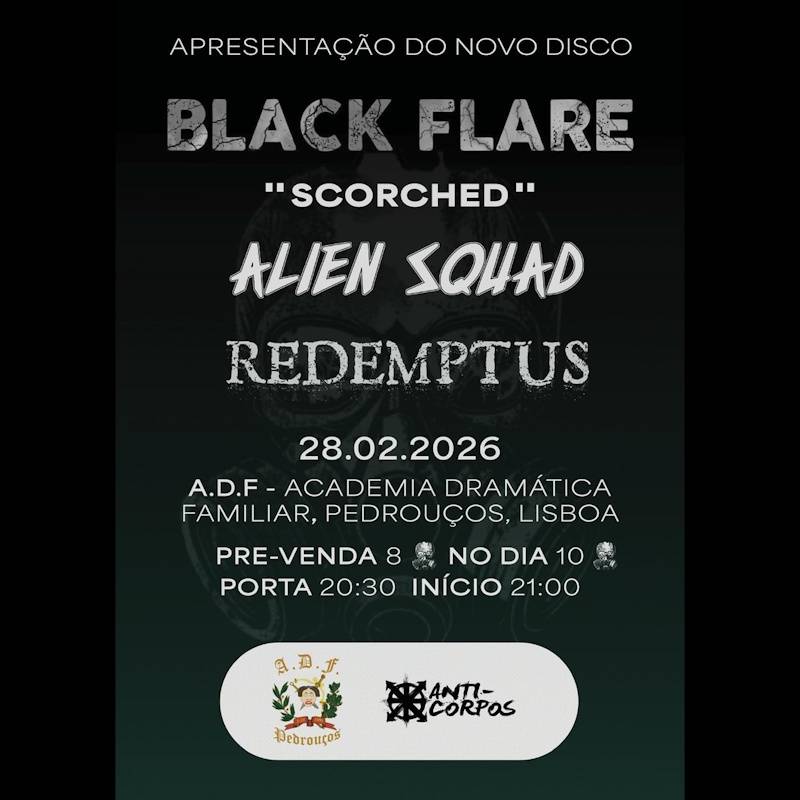 É já no próximo dia 28 de Fevereiro que os Black Flare vão festejar com o público o lançamento do seu novo álbum “Scorched”, lançado no passado dia 18 de Fevereiro pela Anti-Corpos Records. A vesta vai ter lugar na A.D.F. – Academia Dramática Familiar em Pedrouços, Lisboa e vai contar ainda com os Alien Squad e Redemptus. Os bilhetes na pré-venda custam 8€ e no dia 10€, com as portas a abrirem às 20h30 e o início previsto para as 21h.