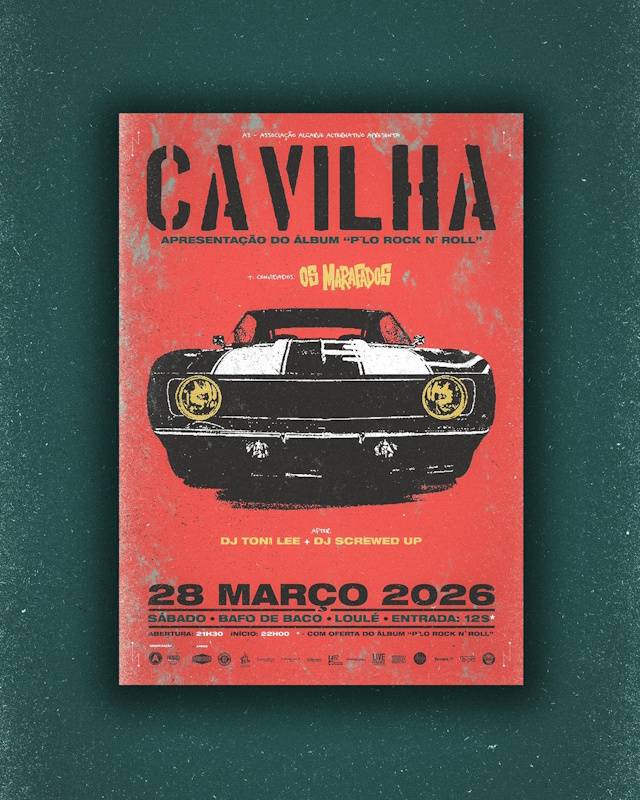 Os Cavilha têm novo lançamento na calha, o seu álbum de estreia “P’lo Rock N’ Roll” e para celebrar o seu lançamento, vão dar um concerto especial no dia 28 de Março no Bafo de Baco, com os convidados especiais Os Marafados e com after party a cargo dos DJ Toni Lee e DJ Screwed Up numa organização da A3 – Associação Algarve Alternativo.