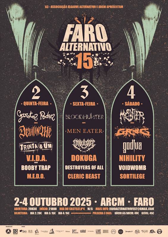 A décima 15 edição do Faro Alternativo já foi anunciada para regressar nos dias 2, 3 e 4 de Outubro e ao mesmo tempo revelou o seu cartaz por inteiro. Com uma produção da A3 – Associação Algarve Alternativo, são 3 dias repletos de grandes nomes da cena nacional (e não só) repartidos por 2 palcos onde vai ser possível ver Garotos Podres, Bloodhunter, Mystifier, Devil In Me, Men Eater, Grog, Trinta & Um, Okkultist, Godiva, V.I.D.A., Dokuga, Nihility, Booby Trap, Destroyers Of All, Voidwomb, M.E.D.O., Cleric Beast e Sortilege. A ter lugar na Associação Recreativa e Cultural de Músicos em Faro, os bilhetes, que vão desde os 15 aos 45eur serão disponibilizados em breve.