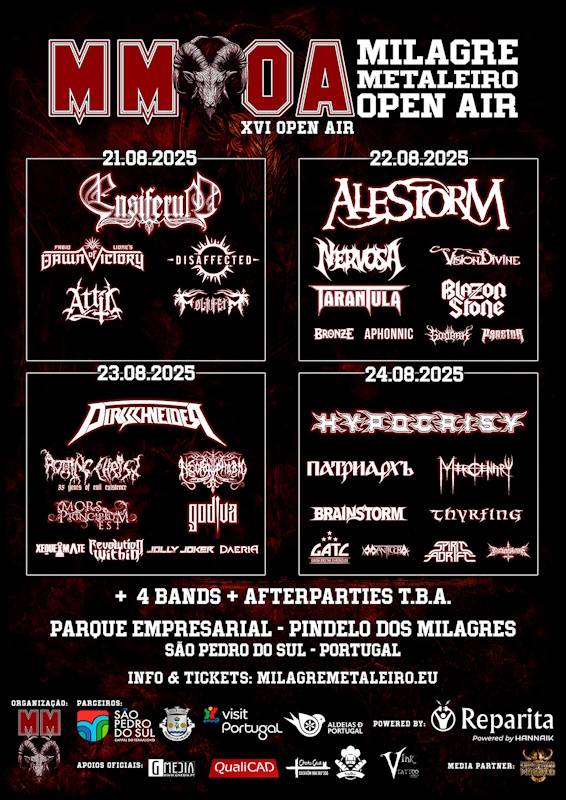 O Milagre Metaleiro Open Air vai já para a sua décima sexta edição e continua a cumprir a tradição de a cada ano subir a fasquia a nível de qualidade. Em 2025 não só de qualidade como de quantidade a fasquia foi elevada com a inclusão de um quarto dia, realizando-se assim entre 21 e 24 de Agosto de 2025. E para garantir que a qualidade não vacila, as últimas confirmações foram Patriarkh, Daeria, Attic e Ensiferum. Abaixo podem conferir às confirmações por dia, sabendo que ainda faltam confirmar quatro bandas para o primeiro dia. A saber, a 21 de Agosto, Ensiferum como cabeças de cartaz, acompanhados por Dawn Of Victory, Disaffected, Attic, Folkheim; dia 22 de Agosto, Alestorm como cabeças de cartaz, acompanhados por Nervosa, Vision Divine, Tarantula, Blazon Stone, Bronze, Aphonic, Godark e Praetor; dia 23 de Agosto, Dirkschneider como cabeça de cartaz, acompanhados por Rotting Christ, Necrophobic, Mors Principium Est, Godiva, Xeque-Mate, Revolution Within, Jolly Joker e Daeria; e finalmente dia 24 de Agosto Hypocrisy como cabeças de cartaz, acompanhados por Patriarkh, Mercenary, Brainstorm, Thyrfing, Girish And The Chronicles, Manticora, Spirit Adrift e Ruttenskalle.