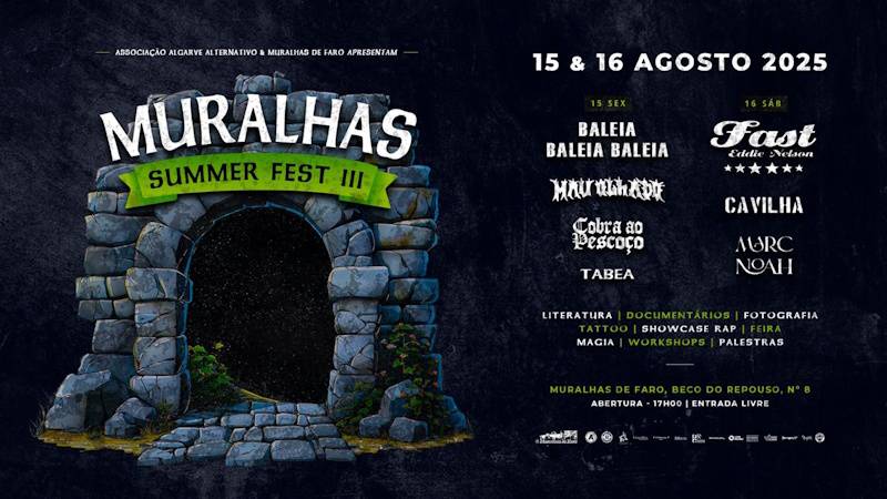 O Muralhas Summer Fest está de volta para a sua terceira edição com dois dias cheios de música com entrada livre numa organização da A3Associação Algarve Alternativo e Muralhas de Faro. A acontecer no dia 15 e 16 de Agosto, nas Muralhas de Faro (também conhecidas como Fortaleza de Faro e Cerca Urbana de Faro), Beco do Repouso, nº8 com a abertura das portas às 17h. A música estará a cardo de, no dia 15, Baleia Baleia Baleia, Mau Olhado, Cobra Ao Pescoço, Tabea. No dia 16, Fast Eddie Nelson, Cavilha, Marc Noah. Para além da música, haverá espaço para muitas outras propostas culturais – literatura, documentários, fotografia, tattoo, showcase rap, feira magia, workshops e palestras.