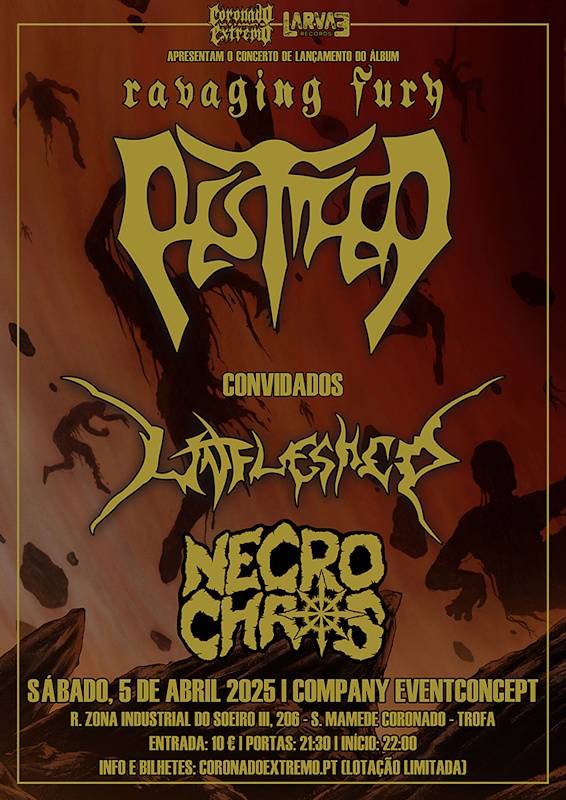 Os Pestifer vão regressar aos palcos em grande! E por um excelente motivo, a apresentação do novo disco “Ravaging Fury”. Será amanhã, dia 5 de Abril, no Company EventConcept, na Vila do Coronado e para tornar a noite de death metal mais intensa vão haver dois convidados: Unfleshed e Necro Chaos. Esta noite com a curadoria Coronado Extremo e Larvae Records tem lotação limitada, portanto não se deixem dormir. Podem comprar os bilhetes em www.coronadoextremo.pt.