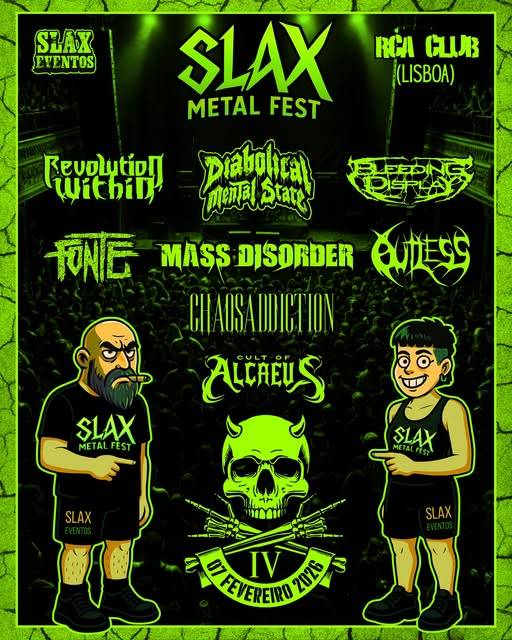 Em 2026 o Slax Metal Fest estará de volta para mais um cartaz demolidor composto por Revolution Within, Diabolical Mental State, Bleeding Display, Fonte, Mass Disorder, Outless, Chaos Addiction, Cult Of Alcaeus. 7 de Fevereiro, Sábado, no RCA Club, esta será uma festa obrigatória para quem ama e apoia o underground nacional em mais um evento da Slax Eventos. Está disponível até 10 de Janeiro de 2026 o pack fest onde por 35€ poderão adquirir o bilhete, a tshirt e o copo personalizado, tendo ainda direito a uma bebida ligeira. Também está disponível o bilhete normal por 20€ que inclui bilhete, copo e bebida ligeira. Poderão também comprar a Tshirt ou Top alusiva ao festival por 15€ Os mesmos podem ser comprados aqui.
