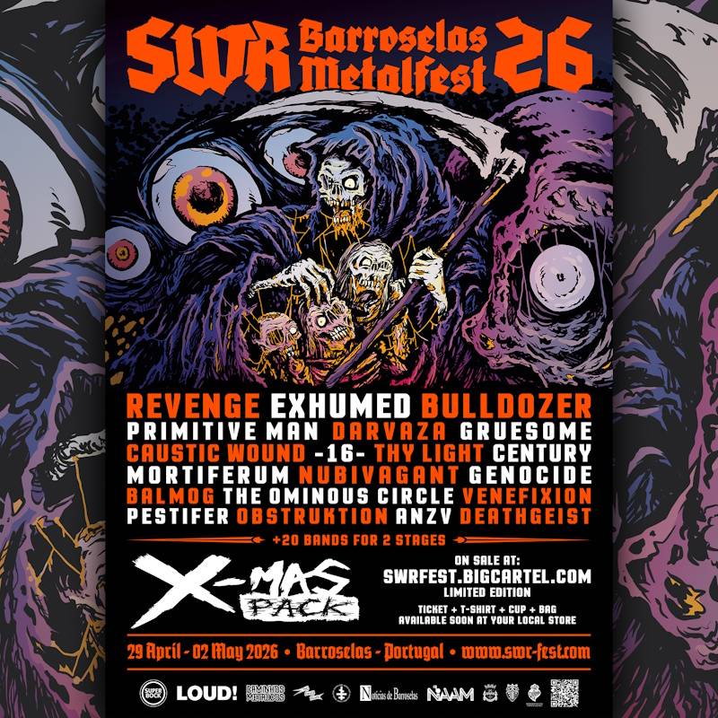 Como é tradicional a SWR Inc. apresentou os primeiros 20 nomes a figurar no cartaz do próximo SWR Barroselas Metalfest a  ter lugar entre 29 de Abril e 2 de Maio de 2026. Os primeiros 20 nomes revelados garantem já o interesse de qualquer metálico apreciador de música extrema. A saber: Revenge, Exhumed, Bulldozer, Primitive Man, Darvaza, Gruesome, Caustic Wound, -16-, Thy Light, Century, Mortiferum, Nubivagant, Genocide, Balmog, The Ominous Circle, Venefixion, Pestifer, Obstruktion, Anzv e Deathgeist. O equilíbrio entre a qualidade das propostas nacionais e internacionais garantem mais uma vez um cartaz que na suja metade vale já pelo seu todo. Como é habitual, já está disponível para aquisição o X-mas Pack, composto por o passe para os três dias do festival, uma t-shirt especial, uma caneca e saco. O mesmo pode ser adquirido aqui.