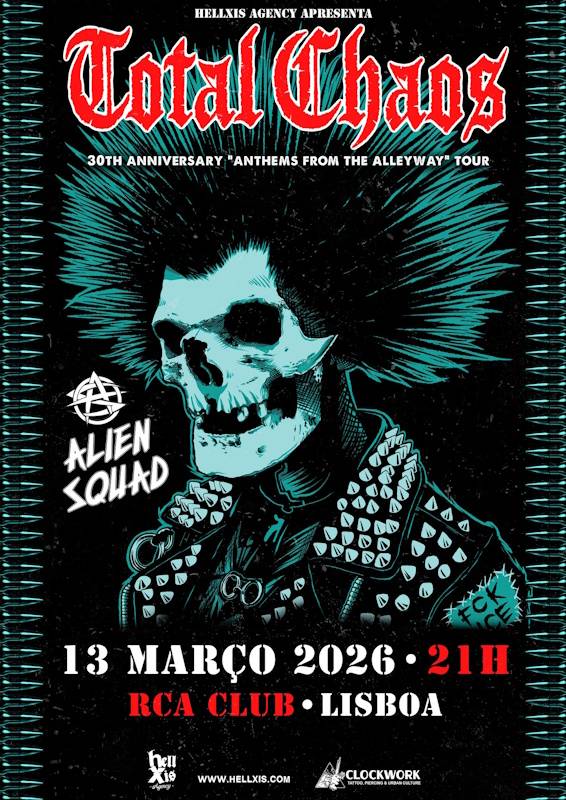 A Hell Xis Agency anunciou a vinda dos Total Chaos ao nosso país para uma data que se antevê muito especial: 13 de Março de 2026. A digressão de celebração do trigésimo aniversário do mítico “Anthems From The Alleyway” vai passar então pelo RCA Club em Alvalade na data atrás indicada e conta ainda com a abertura a cargo dos Alien Squad. Uma noite que é obrigatória para os fãs de street punk. Os bilhetes estão à venda no site da Clockwork Store ou directamente na loja dos Anjos.
