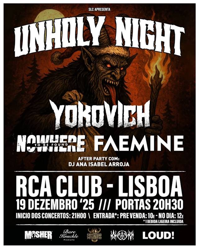 No próximo dia 19 de Dezembro vai haver uma celebração profana no RCA Club com três poderosas bandas do undeground nacional. Yokovich, Nowhere To Be Found e Faemine vão se reunir para uma Unholy Night numa produção da SLC, com as portas a abrir às 20h30 e o início dos concertos apontado para as 21h. A entrada é 10€ em pré-venda e 12€ no próprio dia. A after party está a cargo da DJ Ana Isabel Arroja.
